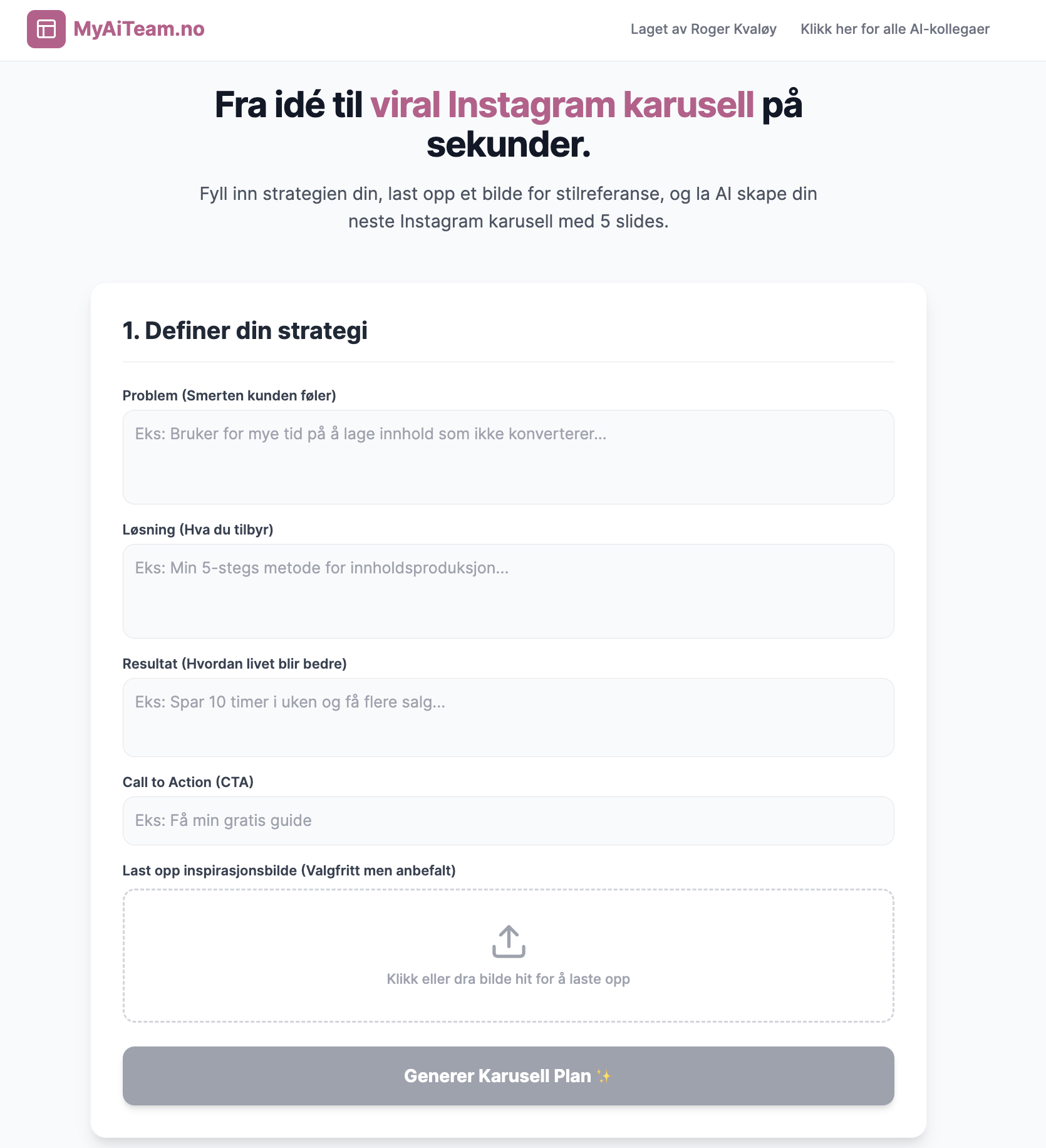 Fra idé til viral instagram karusell på sekunder. Fyll inn strategien din, last opp et bilde for stilreferanse, og la AI skape din neste Instagram-suksess.