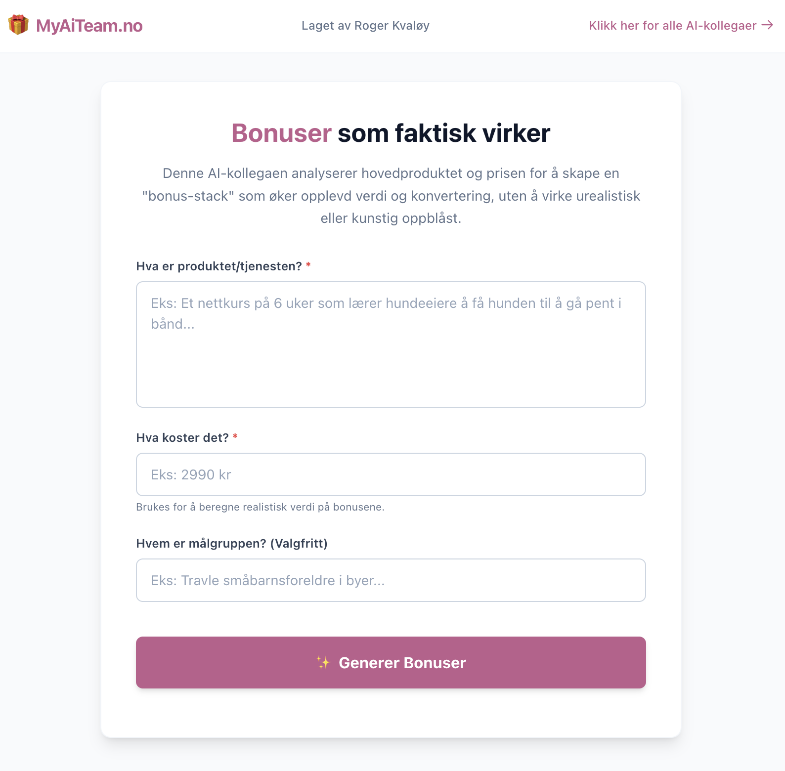Denne AI-kollegaen analyserer hovedproduktet og prisen for å skape en "bonus-stack" som øker opplevd verdi og konvertering, uten å virke urealistisk eller kunstig oppblåst. Sett meg i gang
