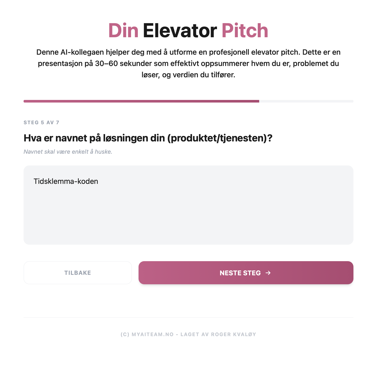 Denne AI-kollegaen hjelper deg med å utforme en profesjonell elevator pitch. Dette er en presentasjon på 30–60 sekunder som effektivt oppsummerer hvem du er, problemet du løser, og verdien du tilfører.