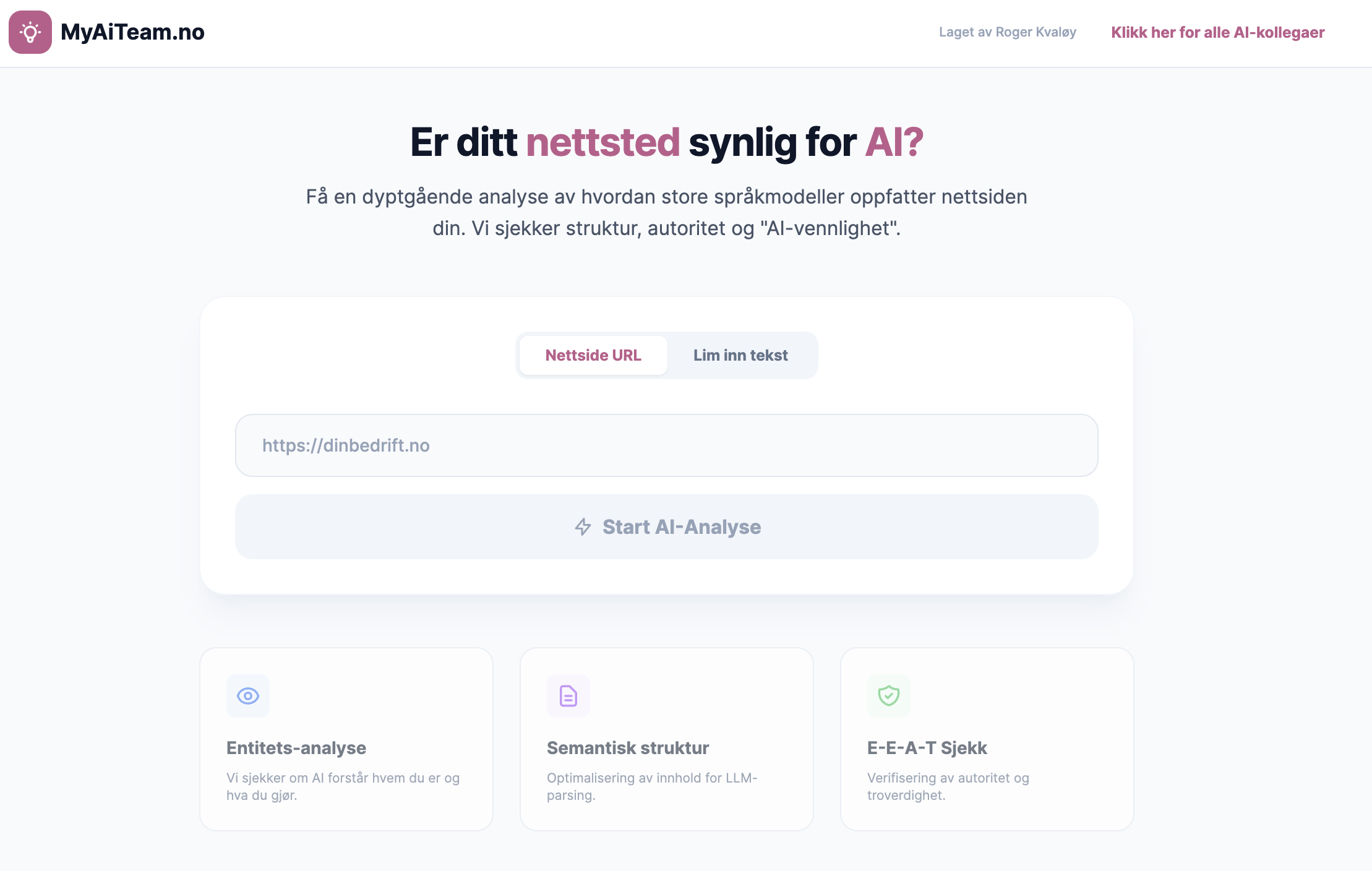 Få en dyptgående analyse av hvordan store språkmodeller oppfatter nettsiden din. Vi sjekker struktur, autoritet og "AI-vennlighet". Sett meg i gang
