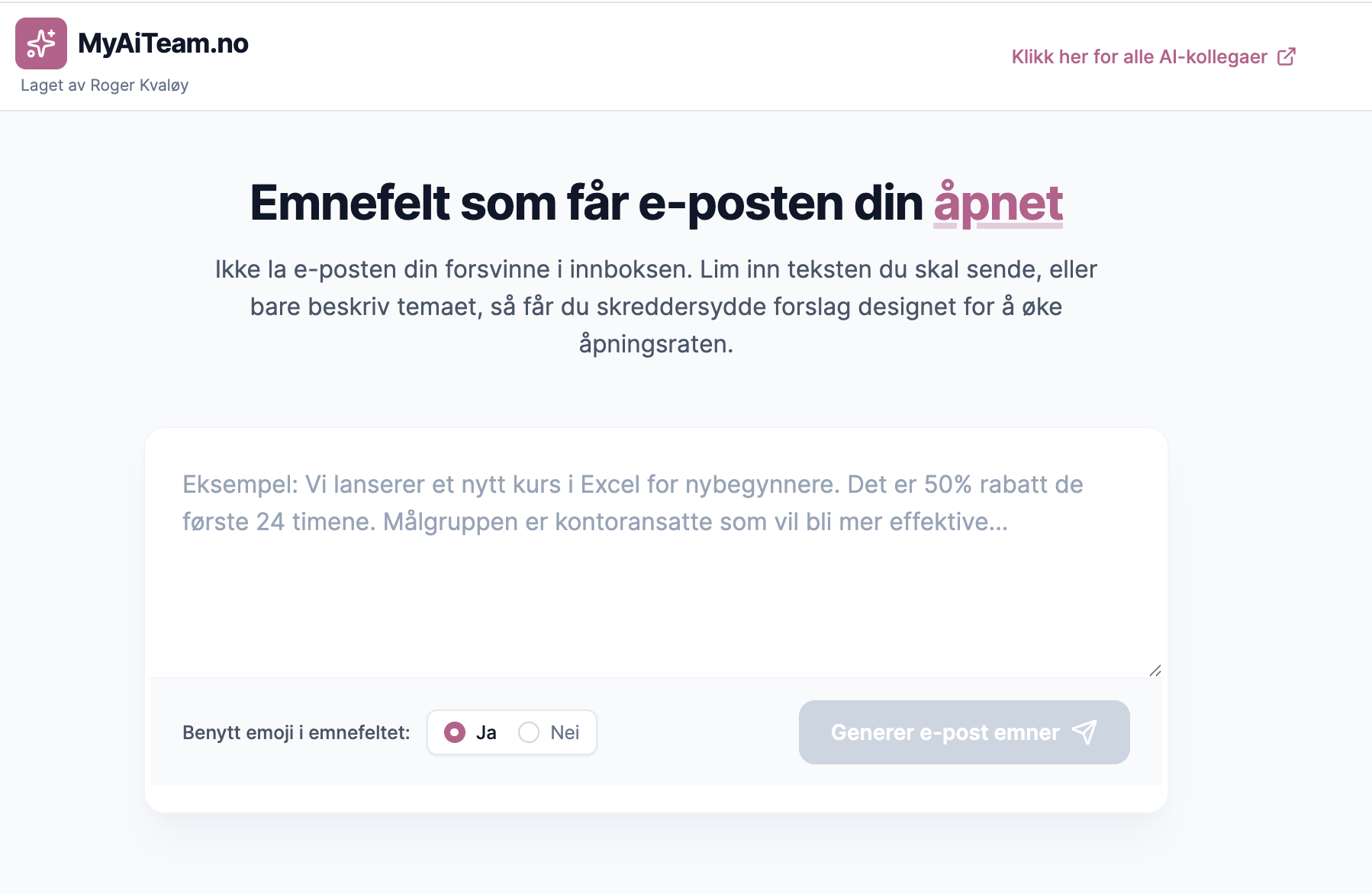 Ikke la e-posten forsvinne i innboksen. Få skreddersydde emnefelt basert på innholdet ditt, designet for å øke åpningsraten. Sett meg i gang