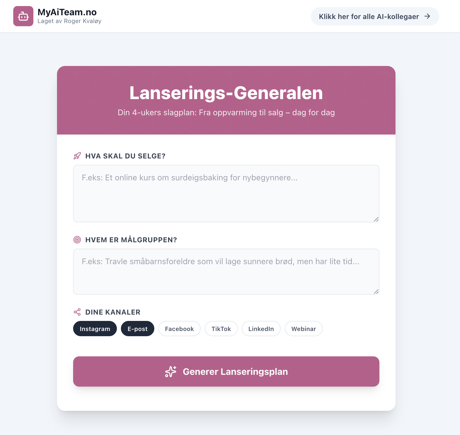 Din 4-ukers slagplan: Fra oppvarming til salg – dag for dag. Slutt å stresse med hva du skal poste. Denne AI-kollegaen fungerer som din markedssjef og gir deg en komplett dag-for-dag kalender for de neste 4 ukene. Sett meg i gang