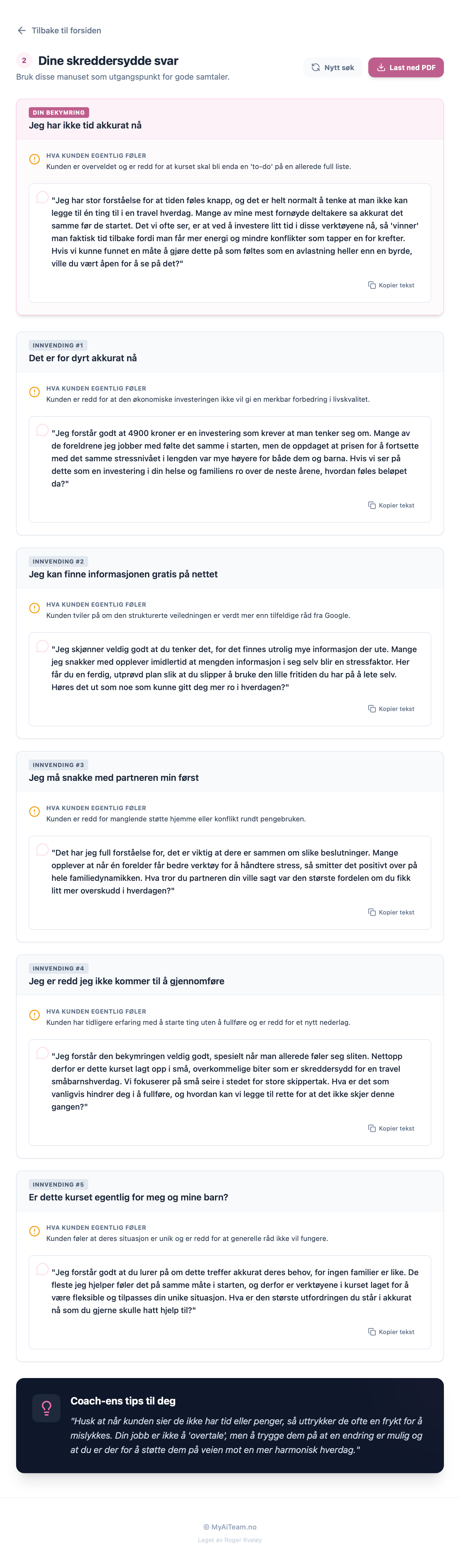 Bli trygg i møte med kundenes tvil. Denne AI-kollega forutser 5 vanlige innvendinger og gir deg empatiske, ferdige svar som hjelper deg å selge med hjertet – helt uten press.
