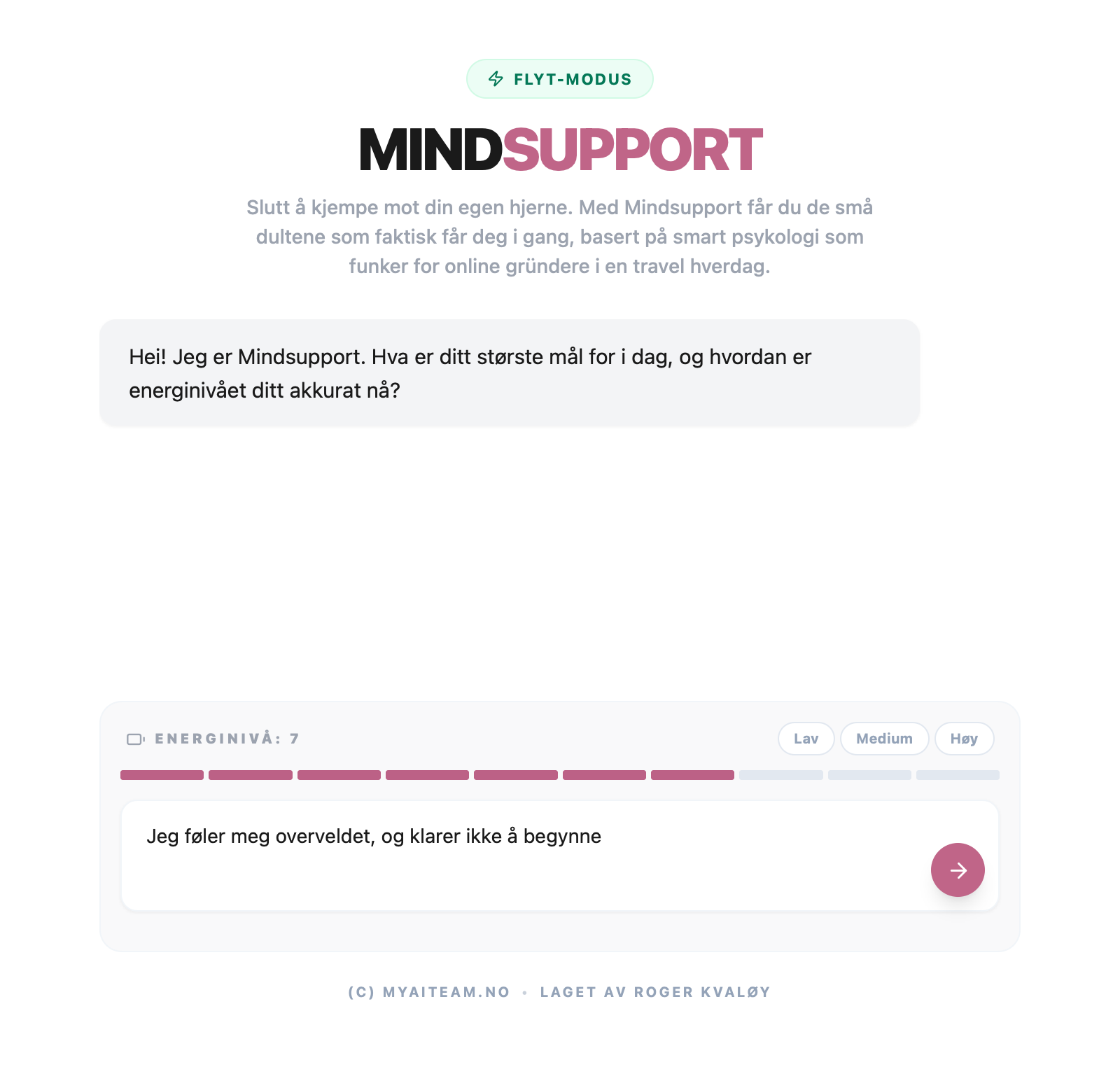 Slutt å kjempe mot din egen hjerne. Med Mindsupport får du de små dultene som faktisk får deg i gang, basert på smart psykologi som funker for online gründere i en travel hverdag.